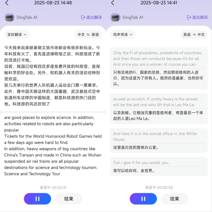 界面新闻记者通过播放一段央视新闻的播报和一段英文谈话体验了DingTalkA1的实时翻译功能。整体来看,DingTalkA1对中文的处理要好过英文。在中文新闻的播报中,DingTalkA1的实时翻译功能除了没能识别出极个别专有名词之外,整体识别的准确率非常高,其把中文翻译成英文的准确率也比较高。在英文谈话中,实时翻译功能对人名、专有名词的识别准确率还有待提升。